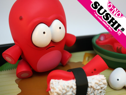 Finally, I order oh-sushi at Rotofugi! Isn't it look delicious? Unfortunately, it is a toy not food!! Andrew Bell, whom designed this adorable Octopus figure and packed with sushi box. Also the price is really good! It only cost me 25 USD to bring him home!!!